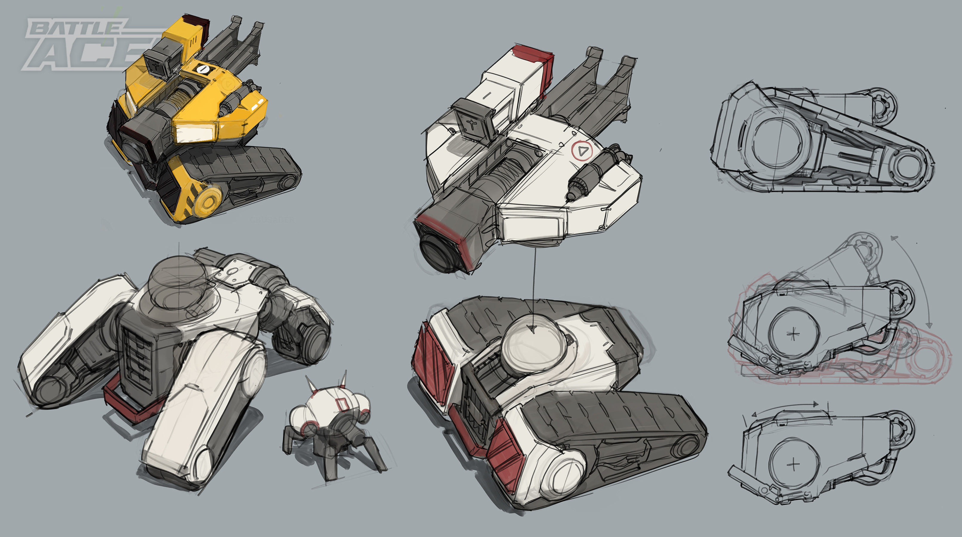 One of the first heavy tanks I designed for the game, the Crusader. We had https://www.artstation.com/mrpink77 doing some extra work for us at the very start of the project and he did some fun work for this guy early on - and while this tank ended up with more classic treads I did reuse the four-legged track look later for the Mammoth.