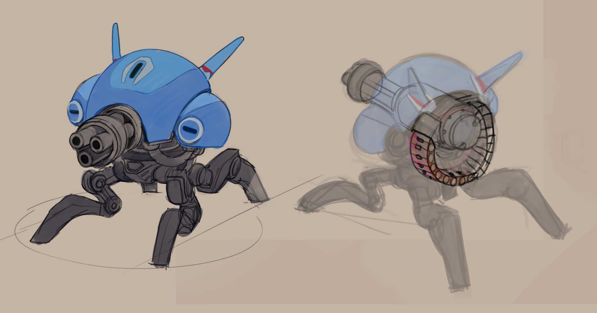 Possibly the very first sheet of unit sketches for the project, the prototype Gunbot being center left. the Scorpion also ended up staying pretty similar to this first draft!
