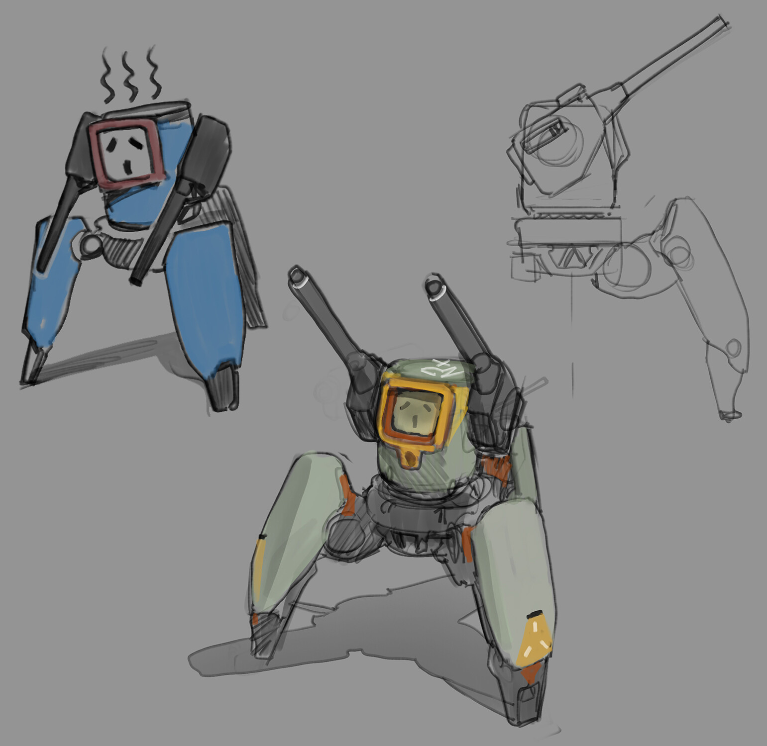 I settled on a pretty retro look, and characterful faces for more of the units compared to some of the more serious military bots elsewhere in the game.