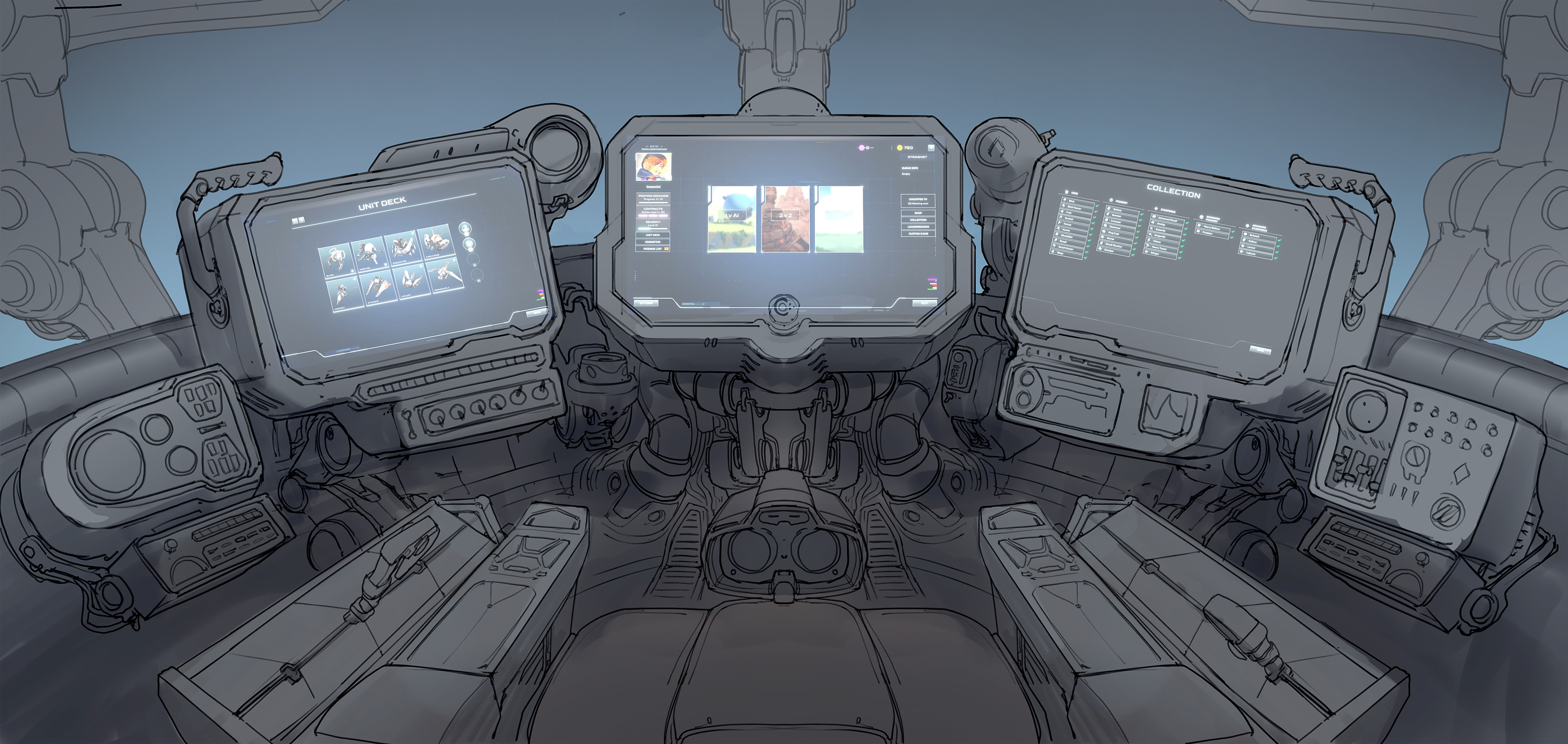 We had worked hard to get the Cinematic design looking like something you could actually use to control your army, and the main challenge in this concept was to design something that a 3D menu camera could move cleanly around without getting frustrating or disorienting for the player.